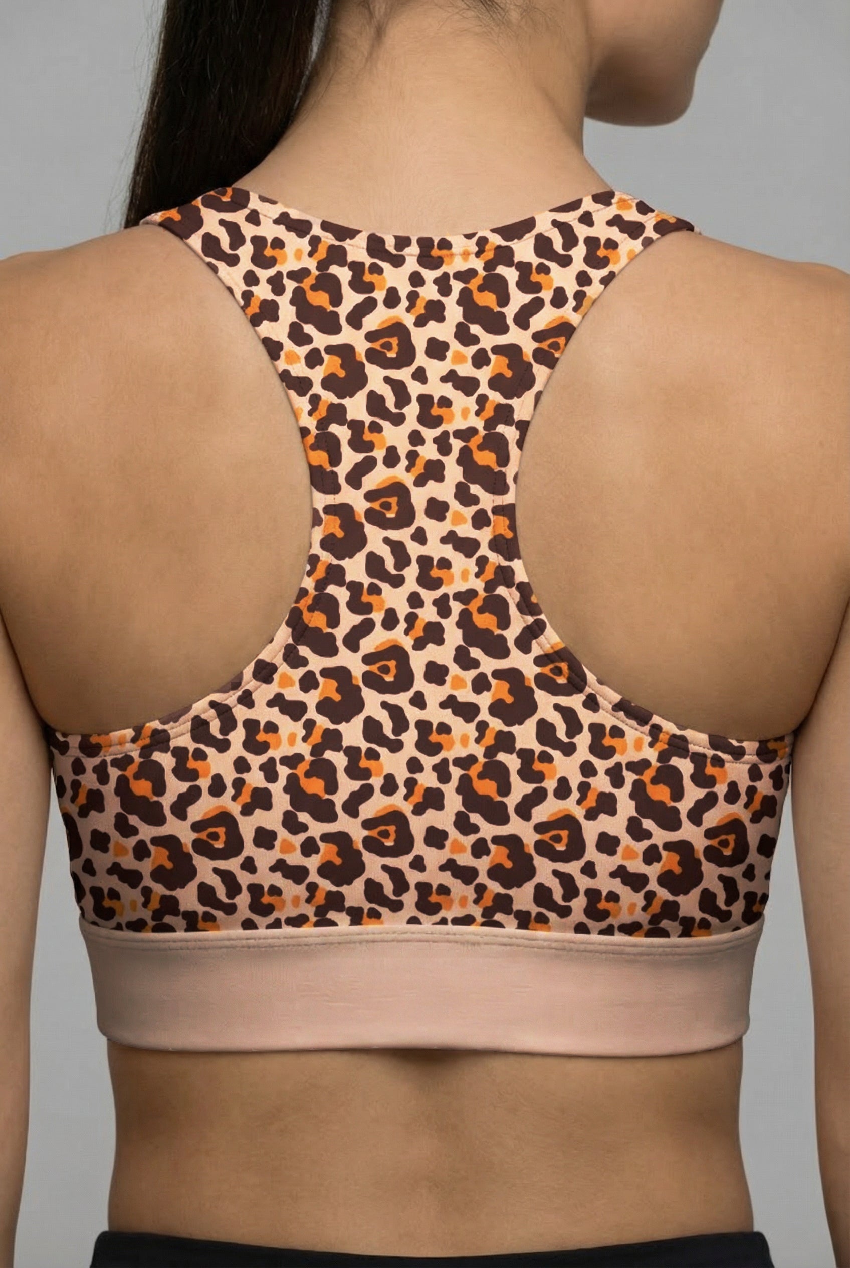 Some prints never fade. Our Classic Leopard Custom Sports Bra brings back the iconic graphic animal print that is a staple in every fitness wardrobe. Featuring a warm palette of mocha browns, deep blacks, and energetic pops of orange, this bra balances retro charm with modern performance.