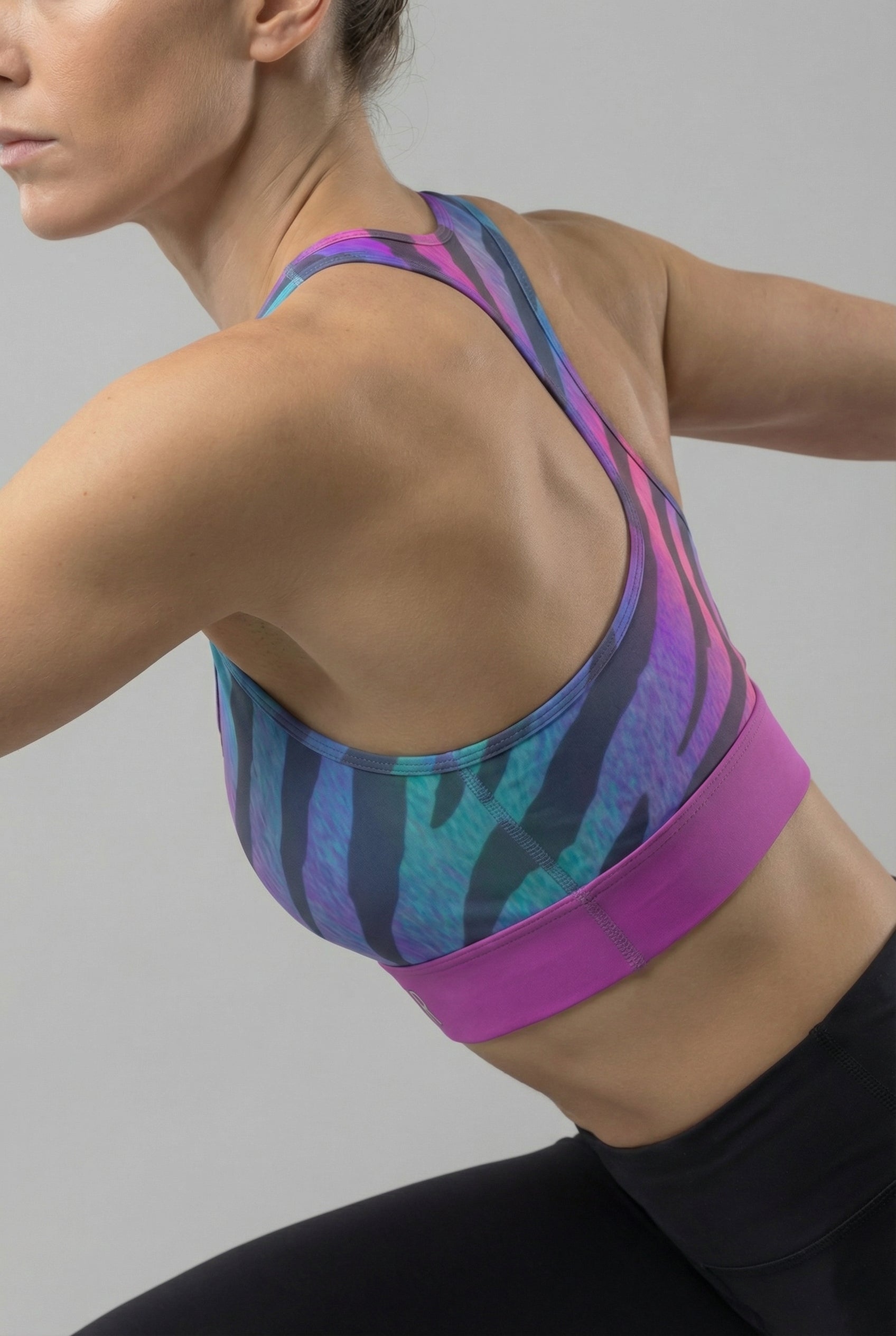 Blur the line between the wild and the electric with our "Cosmic Zebra" Gradient Custom Sports Bra. This design features untamed zebra stripes set against a mesmerizing ombré background that shifts from electric purple to cool teal—like a neon jungle or a galaxy far away.